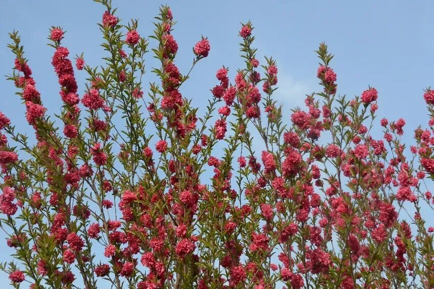 王力荣研究员介绍,一般的重瓣桃花直径大约在4~5厘米,花瓣数量只有20多个。但“万重红”由“菊花桃”为母本、“红根甘肃桃”为父本杂交而成,花为蔷薇型,花瓣红色,外围花瓣张开,蕊部花瓣内卷、皱缩,花瓣轮数30~40轮。